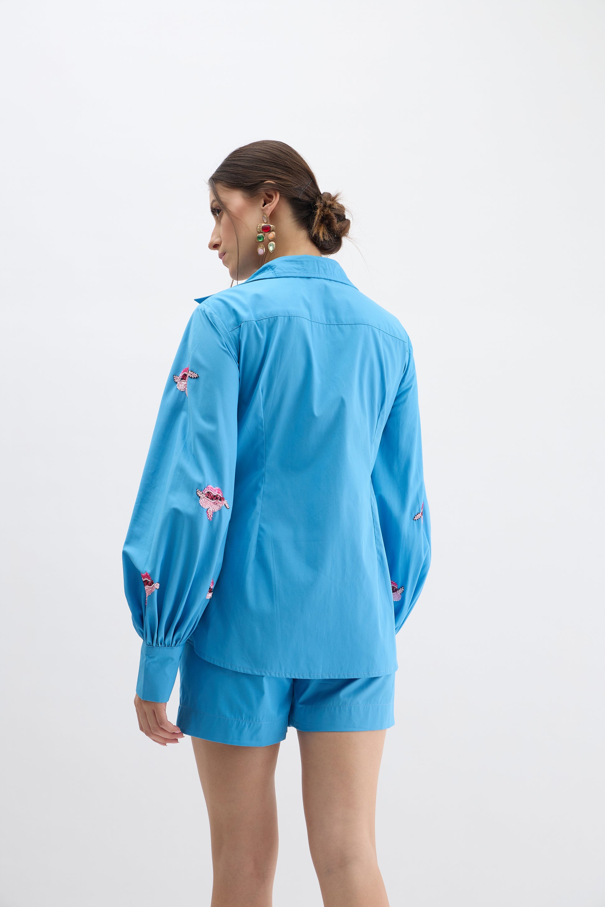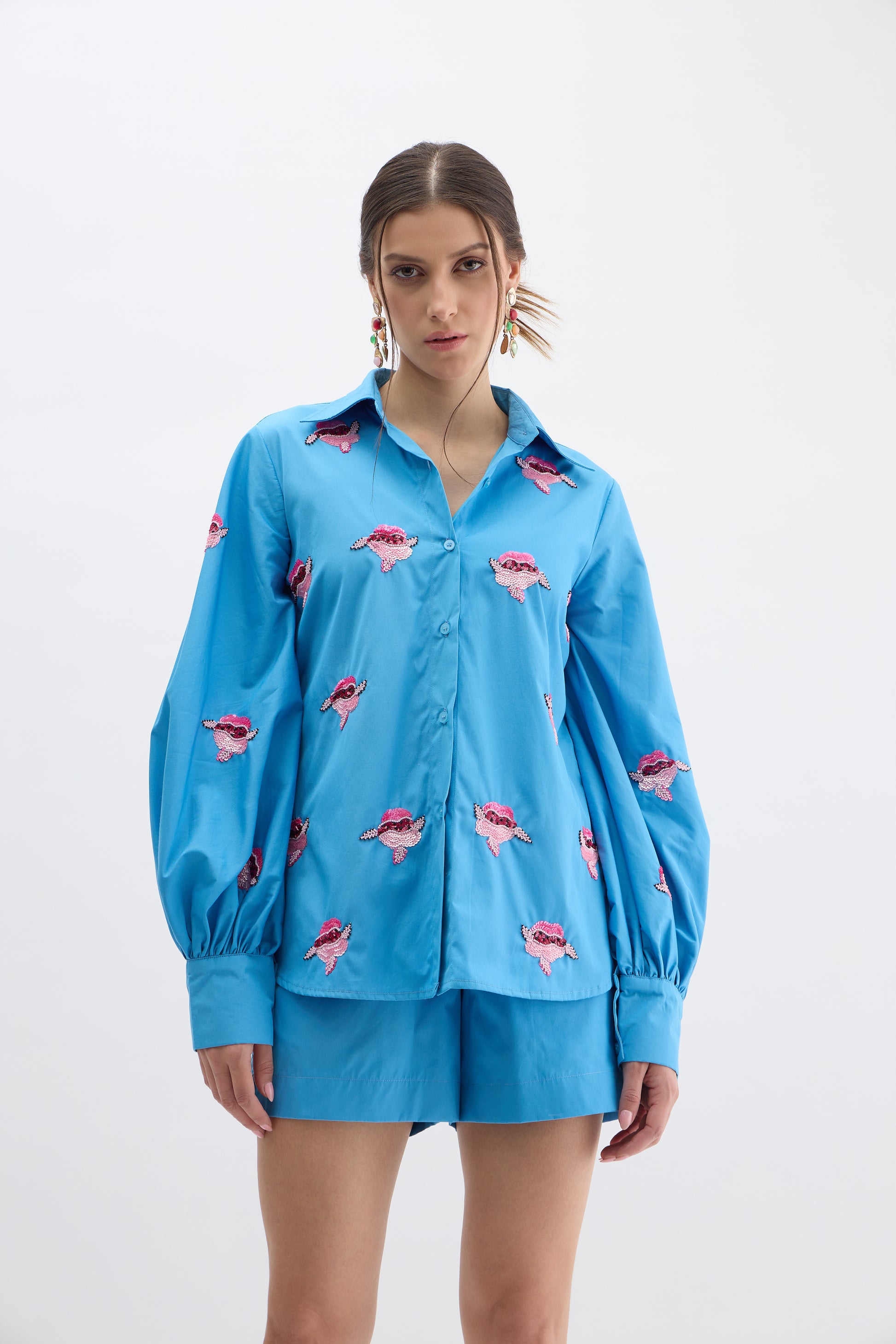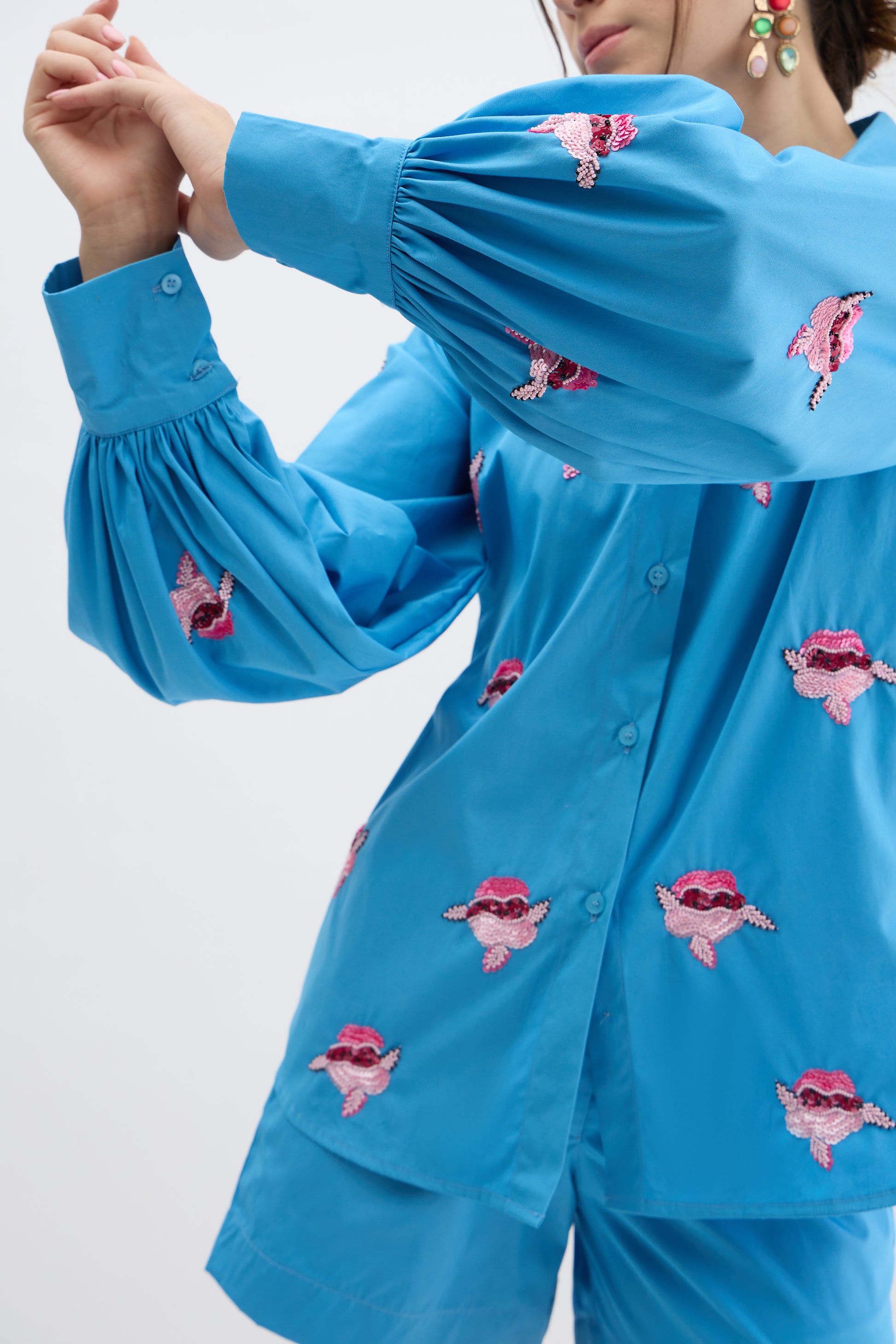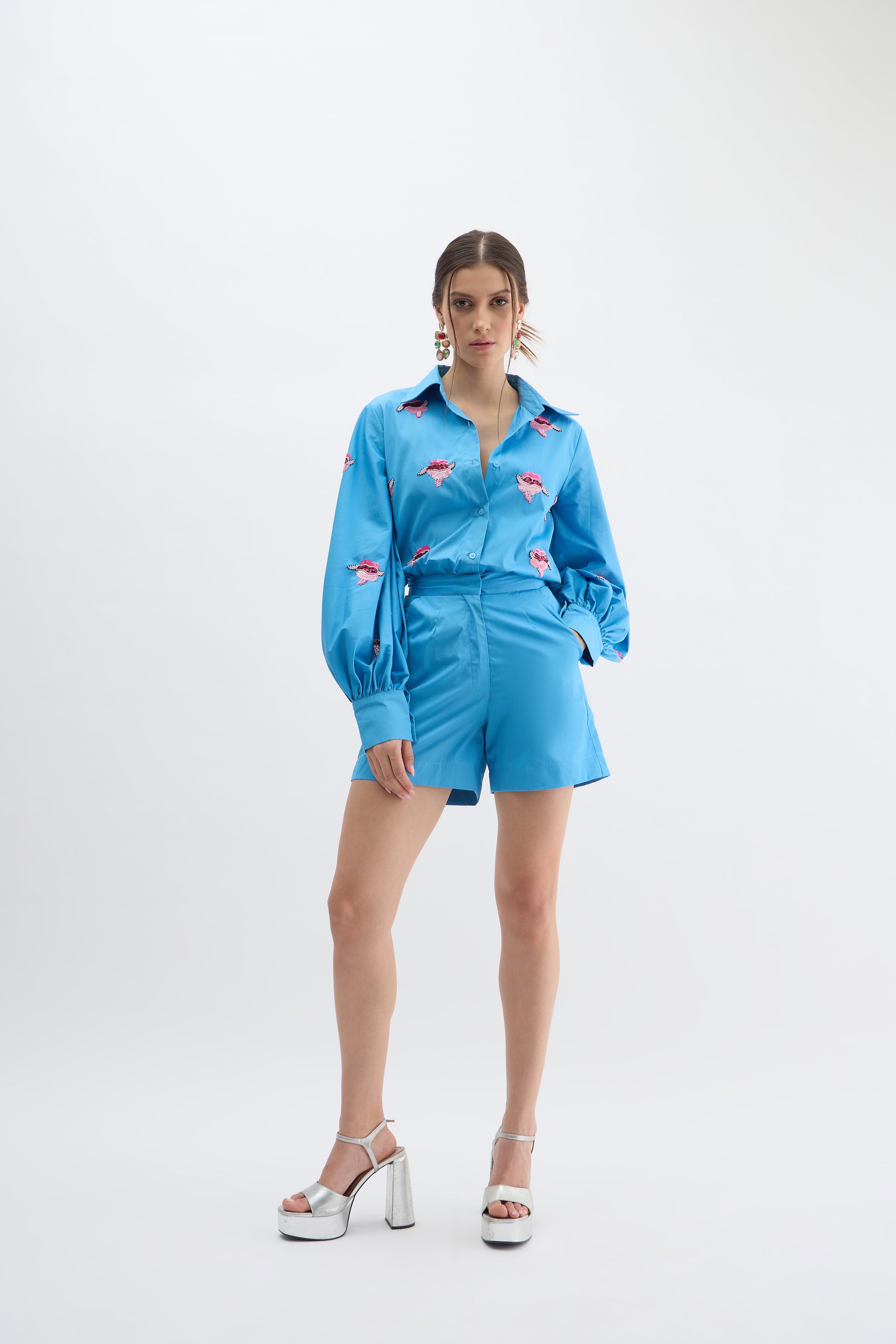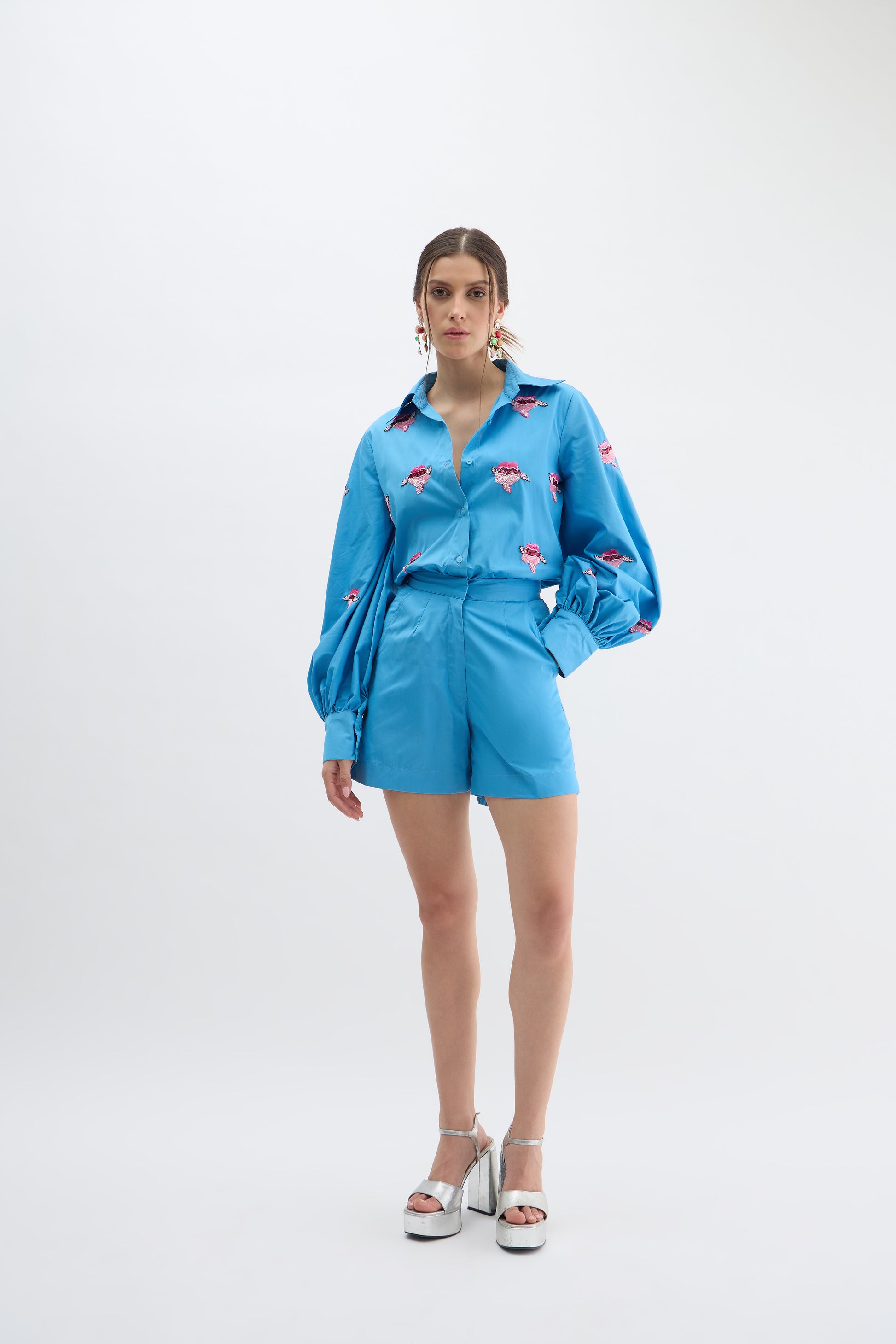 Bright, bold, and dripping with personality — the Sky Attitude Co-Ord Set is designed for those who love to dress loud and proud. Made from 100% pure cotton, this vibrant sky blue two-piece is breathable, lightweight, and perfect for turning up the charm on sunny days. The shirt features a voluminous silhouette with playful balloon sleeves and shimmering sequin lip motifs embroidered all over — adding a cheeky edge that can’t be ignored. Paired with high-waisted tailored shorts that offer clean lines and structure, this co-ord is a total statement-maker — whether worn together or styled as separates.
