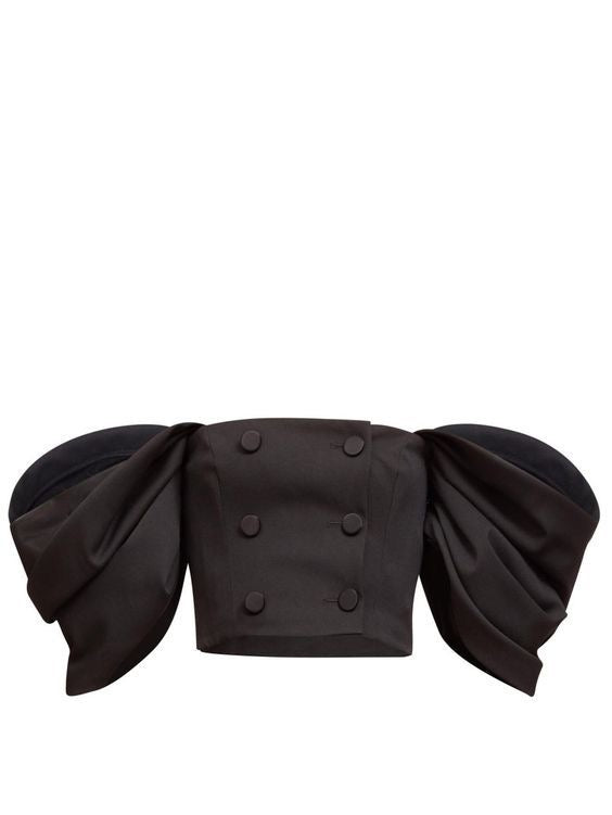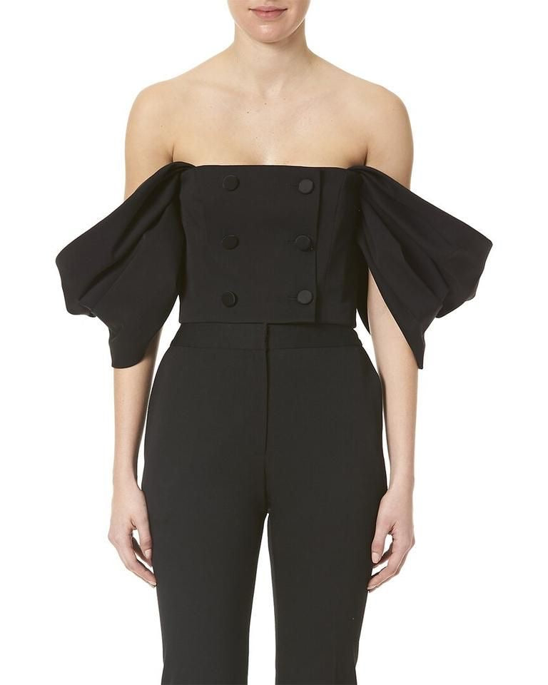 This strapless black top with oversized buttons and ruffled sleeves is a modern classic, adding a touch of glamour and individuality to your wardrobe.