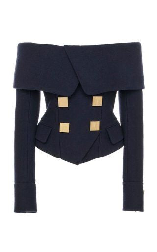 This strapless navy blue top with gold square embellishments is the perfect blend of modern glam and classic elegance, making it a must-have addition to your wardrobe.