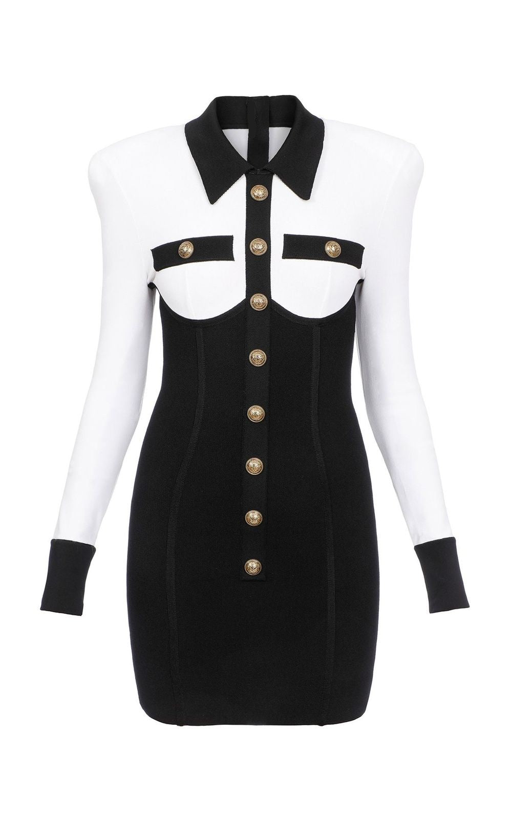 White and Black Formal Full-Sleeve Dress with Gold Buttons